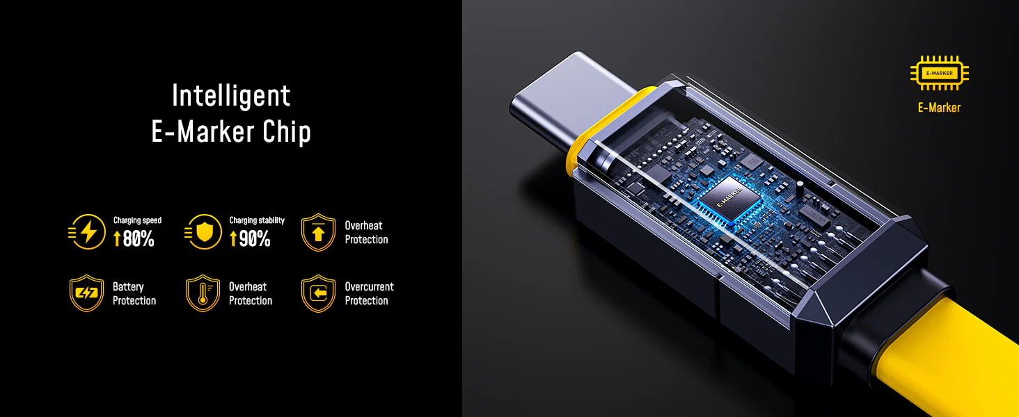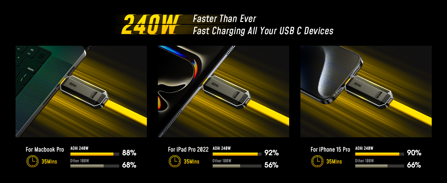 Nhờ Cáp sạc nhanh PD 3.1 Aohi The Future Magflash, bạn có thể sạc các thiết bị USB-C với công suất lên đến 240W. Chỉ trong 30 phút, MacBook Pro 16” có thể đạt mức sạc 56%, giúp bạn tiết kiệm tối đa thời gian. Công nghệ E-Marker tích hợp thông minh sẽ tự động điều chỉnh dòng điện phù hợp, vừa tăng hiệu suất, vừa bảo vệ an toàn cho thiết bị.