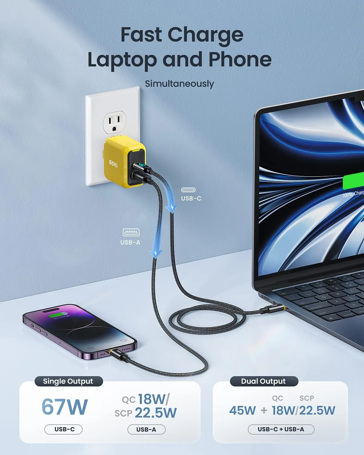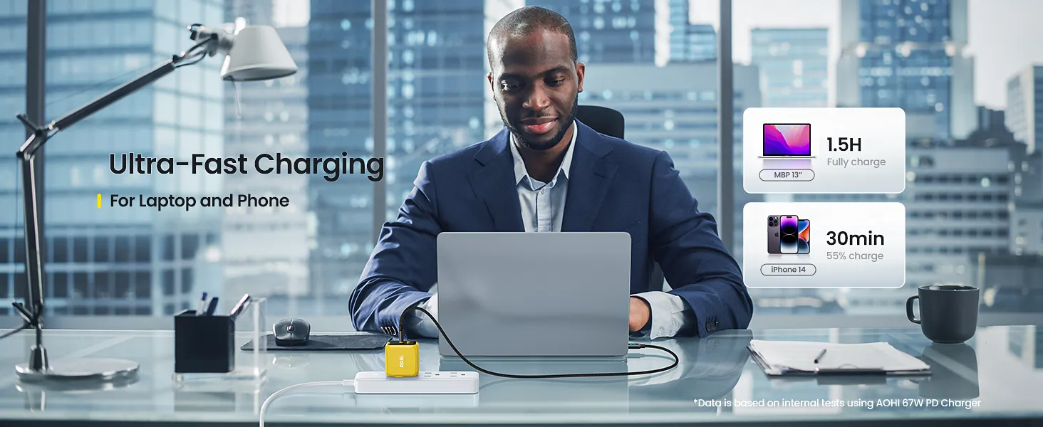 Bộ Sạc GaN Aohi Magcube 67W siêu nhỏ gọn với hai cổng USB-C & USB-A sạc nhanh tương thích cho MacBook, iPhone 17 series, iPad Pro, Galaxy S22/S21 và nhiều thiết bị khác. Aohi Magcube 67W Công Nghệ GaN+ PD sạc nhanh, an toàn và tiện lợi cho văn phòng và du lịch.