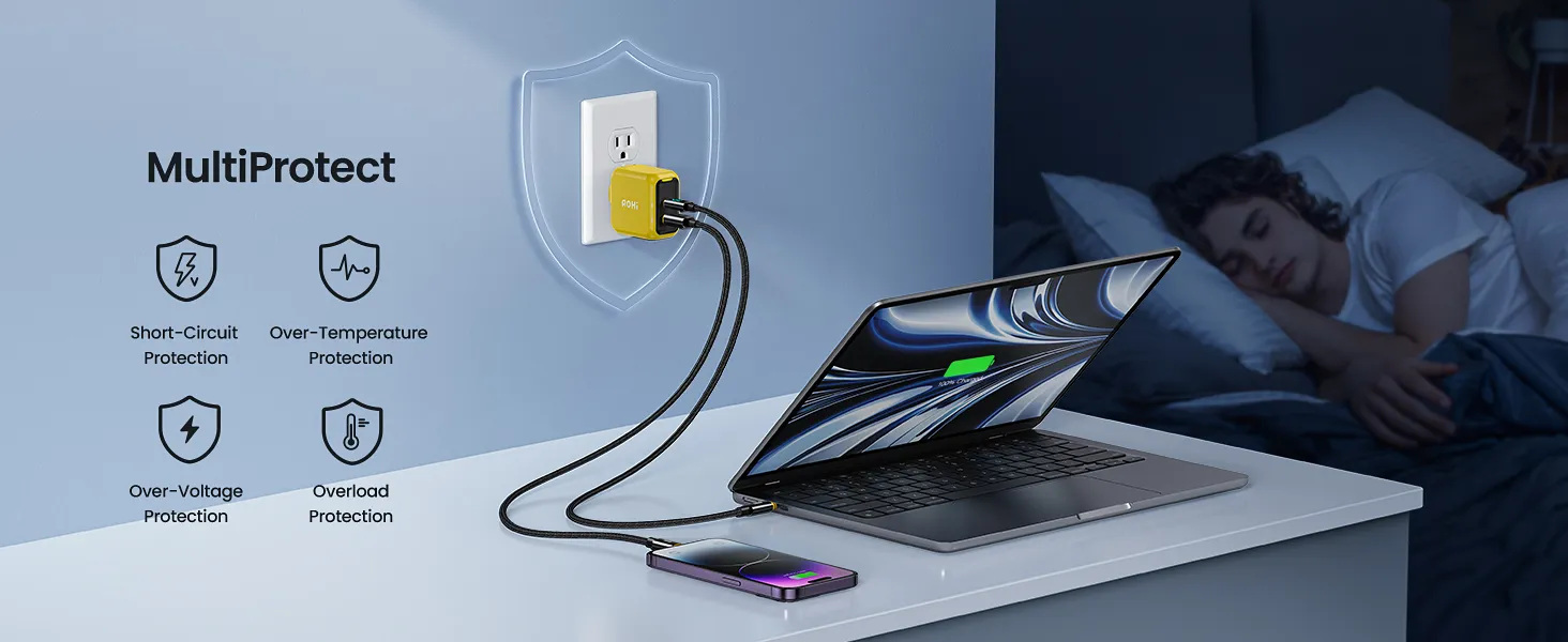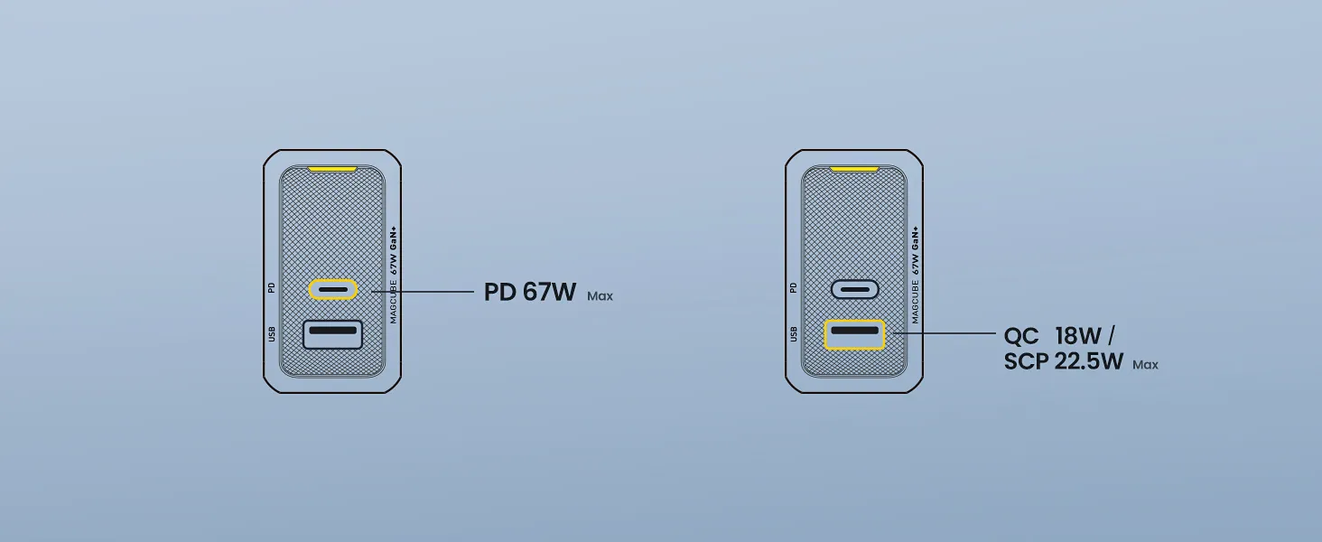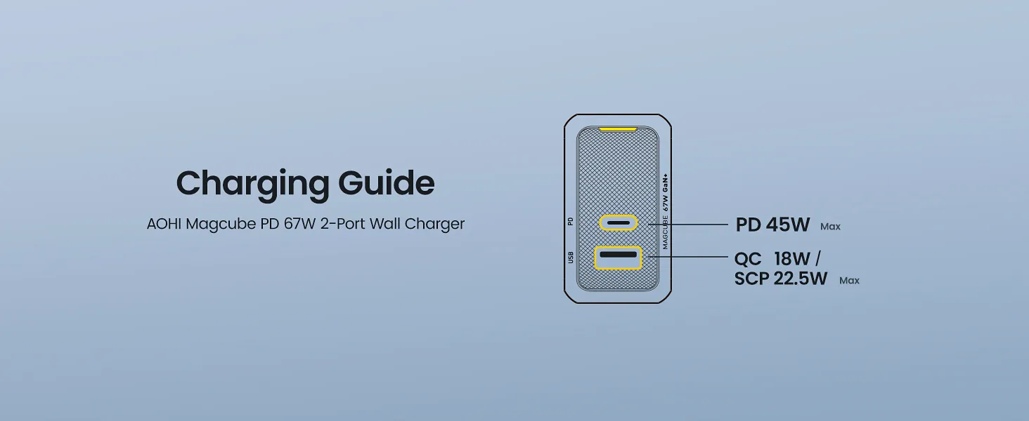 Được trang bị cổng USB-C và USB-A thông minh, bộ sạc nhanh Củ Sạc Nhanh Aohi Magcube 67W GaN+ tự động nhận diện thiết bị và tối ưu nguồn điện, đảm bảo mọi thiết bị được sạc nhanh nhất.