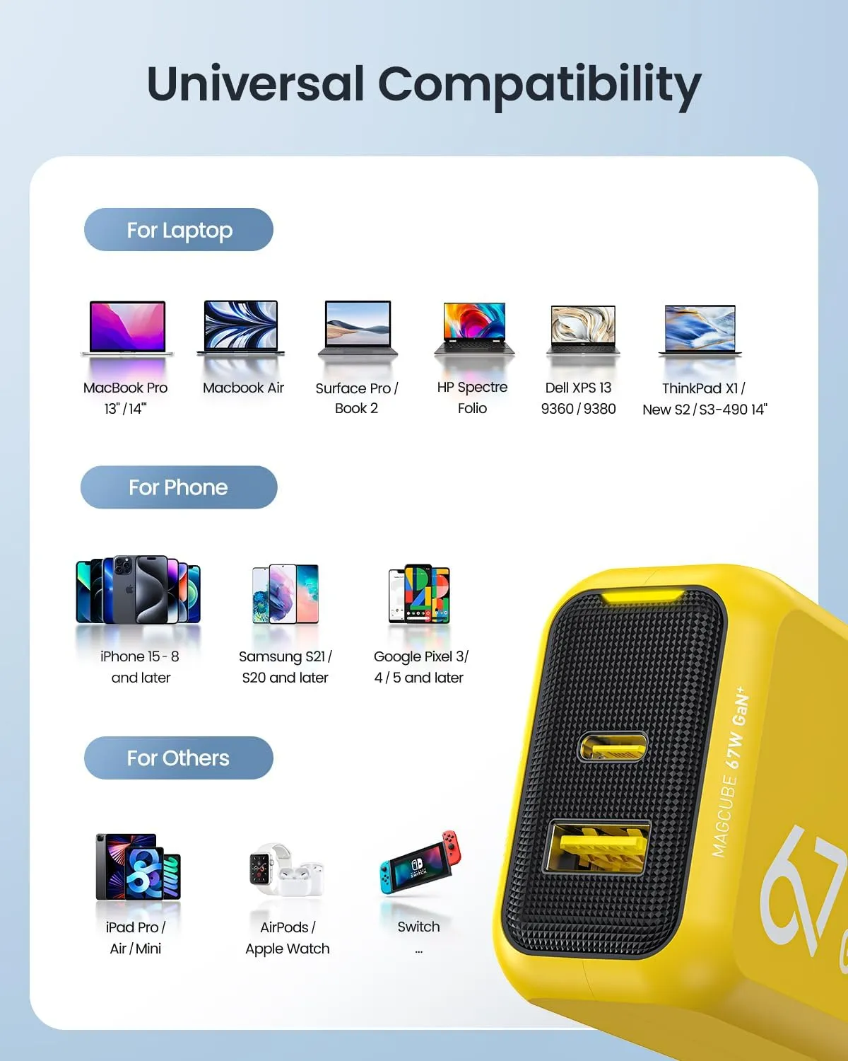 Samsung Galaxy S21/S20/S10, Pixel 3/4/5, Nintendo Switch.