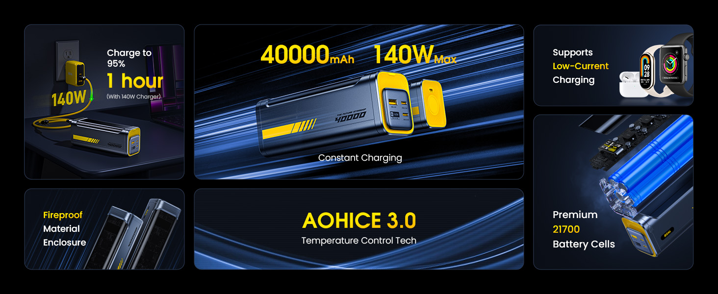 Với dung lượng 40.000mAh, Pin dự phòng AOHI 140W PD3.1 cho khả năng sạc: